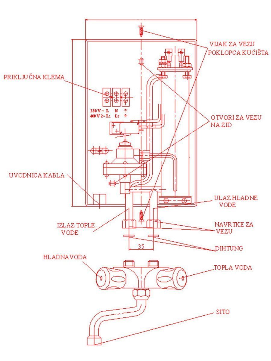 U protočni bojler TERMIL-PGV ugrađen je termostat tako da temperatura izlazne vode ne može biti veća od 60ºC