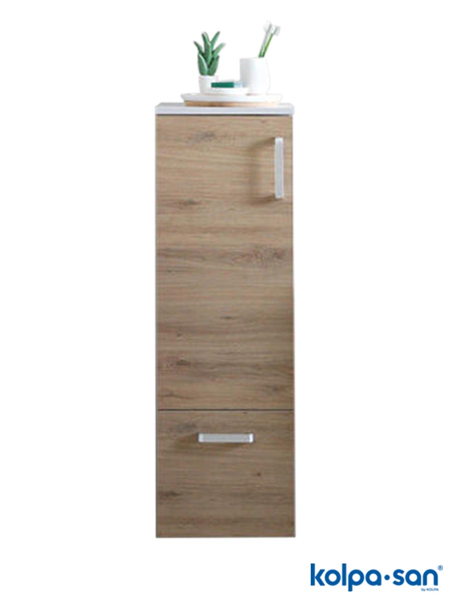 Kupatilski ormarić 37x102cm Evelin KolpaSan siva-hrast izrađen od kvalitetnih ploča univera. Vrata i fioka sa mehanizmom usporenog zatvaranja (softclose mehanizam). Mat ručke u sivoj boji.