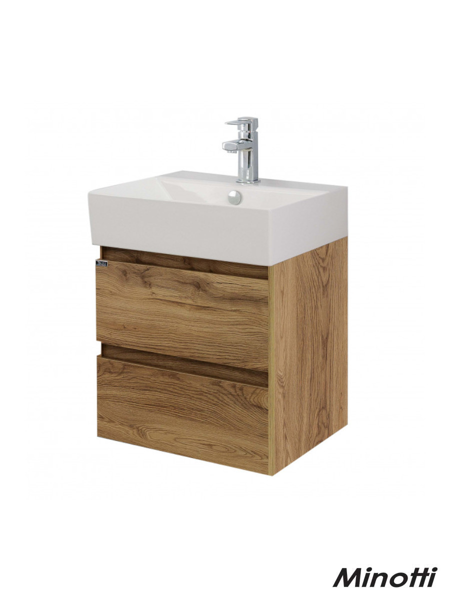 Ormarić od kvalitetnog univera i MDFa u boji drveta, sa keramičkim umivaonikom i fiokama sa soft close mehanizmom.