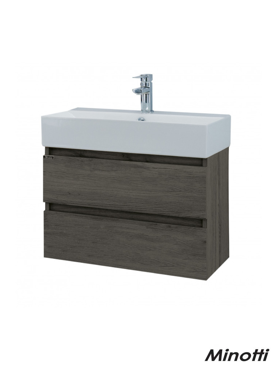 Ormarić od kvalitetnog univera i MDFa u boji drveta, sa keramičkim umivaonikom i fiokama sa soft close mehanizmom.