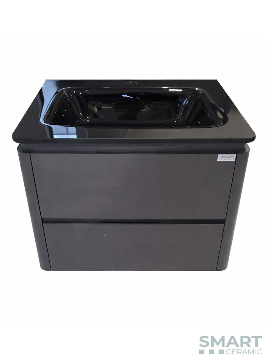 - Stakleni crni lavabo sa ormarićem izrađenim od PVC materijala, lakiran u antracite.