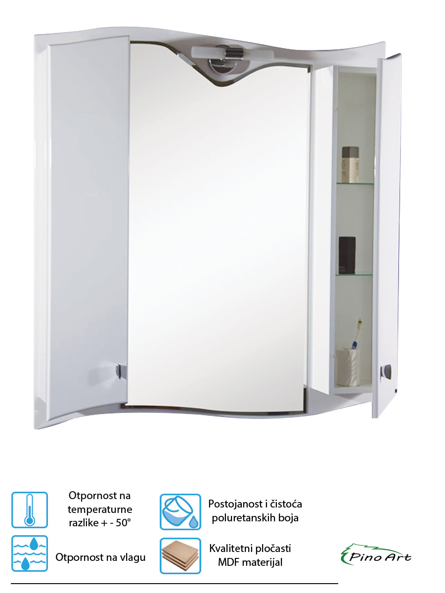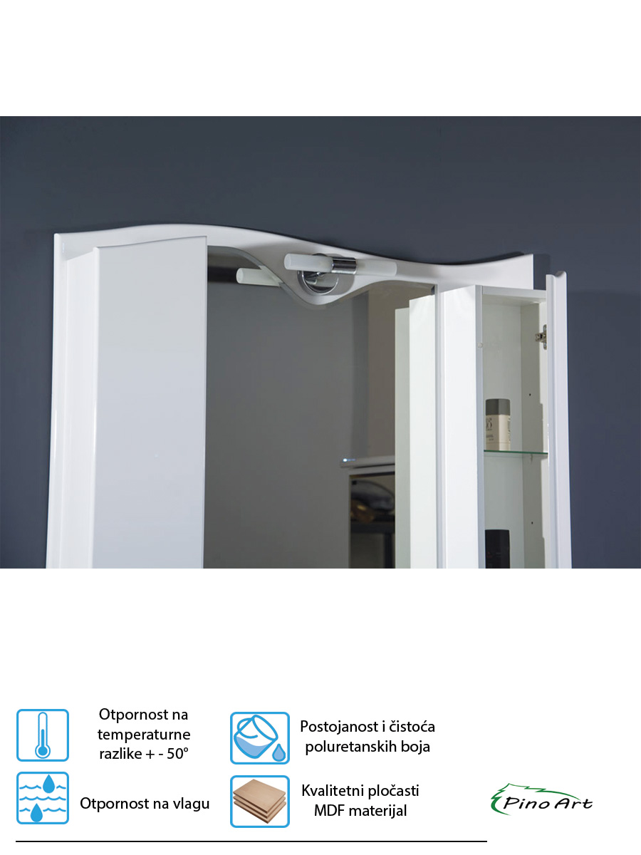 Ogledalo sa ormarićem Pino Art-Mond 105cm-0030 je izrađen od visoko kvalitetnog materijala sa najmodernijom tehnologijom u sferi izrada kupatilskog nameštaja. Ormarić izrađen od kvalitetnog pločastog MDF materijala. Prednost izrade od MDF ploča je duži vek trajanja. Ormarić lakiran u belo visoki sjaj. Bojen poliuretanom koji pruža visoku otpornost na vlagu i postojanost boje. Ručke na ormariću hrom sjaj. Ugrađeno svetlo – halogena kapsula G4, sa prekidačem za aktivaciju.