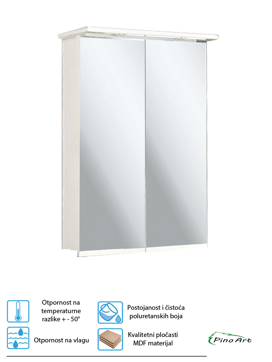 Ogledalo sa ormarićem Pino Art-Mond 64cm-0036 je izrađen od visoko kvalitetnog materijala sa najmodernijom tehnologijom u sferi izrada kupatilskog nameštaja. Ormarić izrađen od kvalitetnog pločastog MDF materijala. Prednost izrade od MDF ploča je duži vek trajanja. Ormarić lakiran u belo visoki sjaj. Bojen poliuretanom koji pruža visoku otpornost na vlagu i postojanost boje. Ručke na ormariću hrom sjaj. Ugrađeno svetlo – halogena kapsula G4, sa prekidačem za aktivaciju.