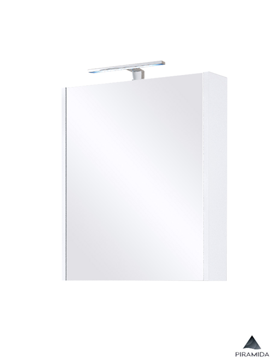 Ormarić sa ogledalom Akva-H 60cm Piramida izrađen najmodernijom tehnologijom u sferi izrade kupatilskog nameštaja predstavlja idealan spoj cene i kvaliteta. Ormarić od kvalitetnog univera – oplemenjene iverice u beloj boji. Ugrađeno led svetlo i mehanizam usporenog zatvaranja – soft close mehanizam.