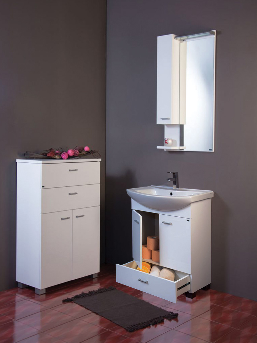 Lavabo sa ormarićem Pino-Art Klasik 65cm-0097 je izrađen od visoko kvalitetnog materijala sa najmodernijom tehnologijom u sferi izrada kupatilskog nameštaja. Front od pločastog MDF-a – medijapana, korpus (bočni deo) ormarića od oplemenjene iverice lakiran u belo visoki sjaj i zaštićen poliuretanom. Poliuretan pruža ormariću otpornost na vlagu, postojanost boje, duži vek trajanja i lakše održavanje. Ručke na ormariću metal mat, nogare PVC mat. Dolazi u kompletu sa keramičkim umivaonikom sa otvorom za slavinu. Pogledajte kompletnu ponudu slavina za lavabo: SLAVINE ZA LAVABO.