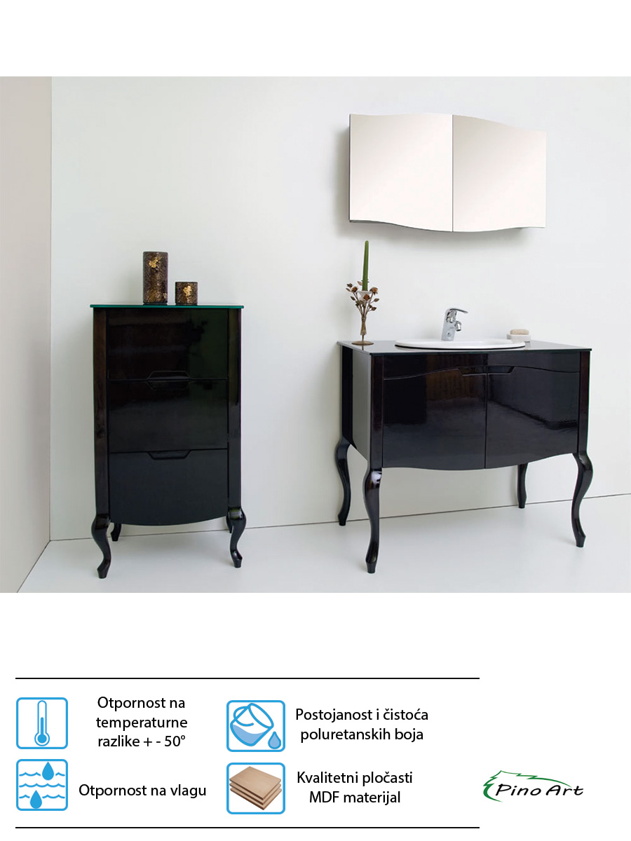 Lavabo sa ormarićem Pino-Art Rustik 95cm-0133 je izrađen od visoko kvalitetnog materijala, MDF-a fundiranog u bukvu lakiran u visoki sjaj. Poseban dah luksuza ovom komadu nameštaja daju stilske masivne nogare – masiv parena bukva i kaljeno staklo na gornjoj ploči. Rustičnog dizajna koji će doprineti potpunom ugođaju u vašem kupatilu.