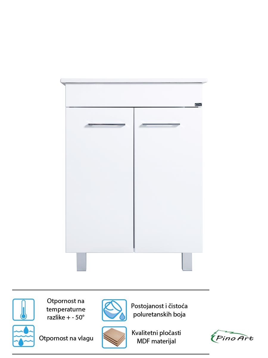 Lavabo sa ormarićem Pino Art-Tempo 61cm je izrađen od visoko kvalitetnog materijala sa najmodernijom tehnologijom u sferi izrada kupatilskog nameštaja. Prednja i bočna strana ormarića od kvalitetnog univera – oplemenjene iverice lakiran u belo visoki sjaj. Ručke na ormariću metal sjaj. Dolazi u kompletu sa keramičkim umivaonikom sa otvorom za slavinu. Pogledajte kompletnu ponudu slavina za lavabo: SLAVINE ZA LAVABO.