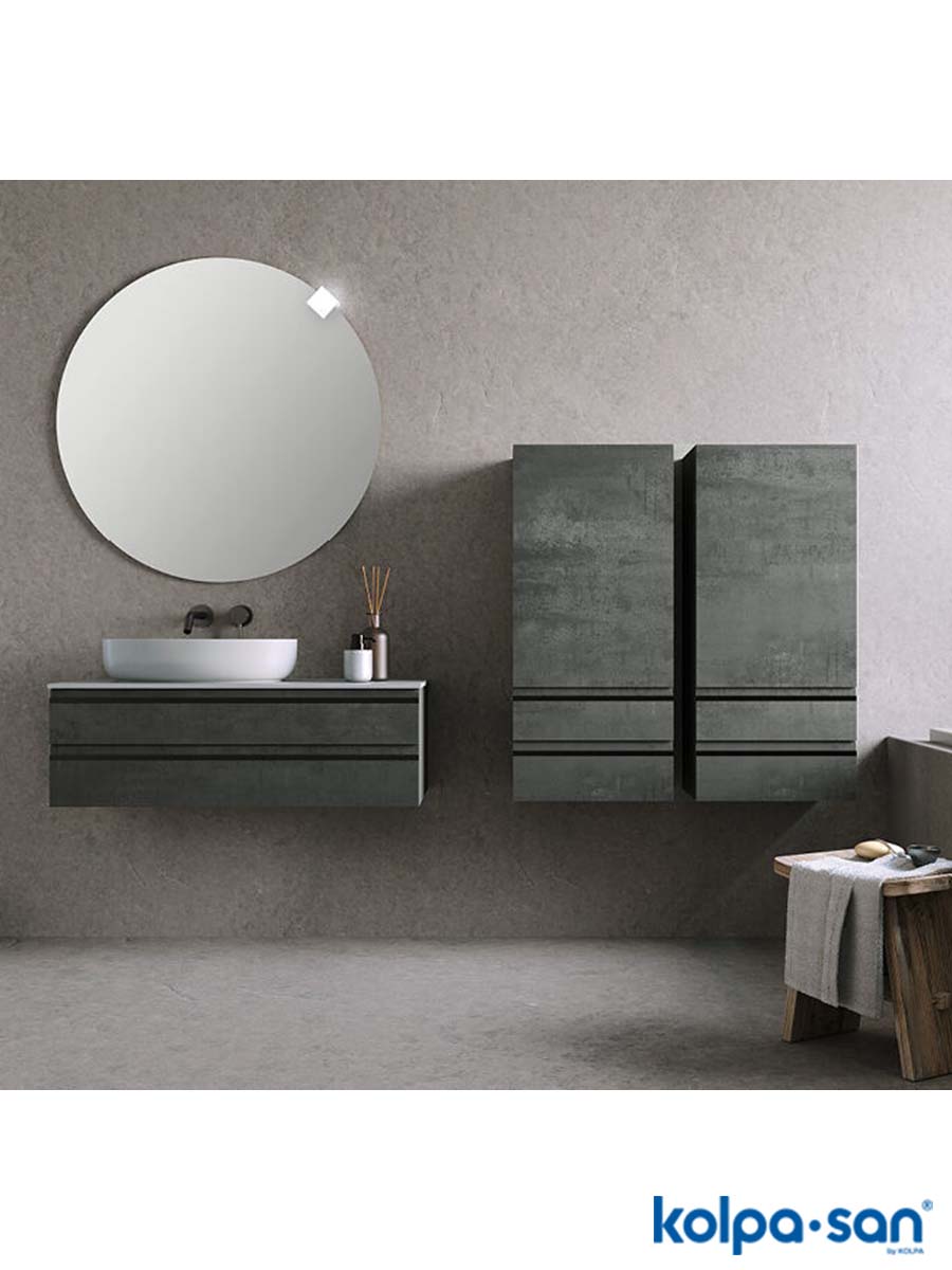 Ormarić za lavabo 120cm Alexis-Beton KolpaSan – Ormarić izrađen od pločastog medijapana sa fiokama za nadgradni umivaonik u dezenu: taman beton. Kerrock ploča bez rupe za ugradnju umivaonika. Fioke sa mehanizmom usporenog zatvaranja (soft close mehanizam) imaju linijsku metalnu ručku. Elegantnog izgleda i smelog dekora, dodat smeo dizajn klasičnom obliku ormarića.