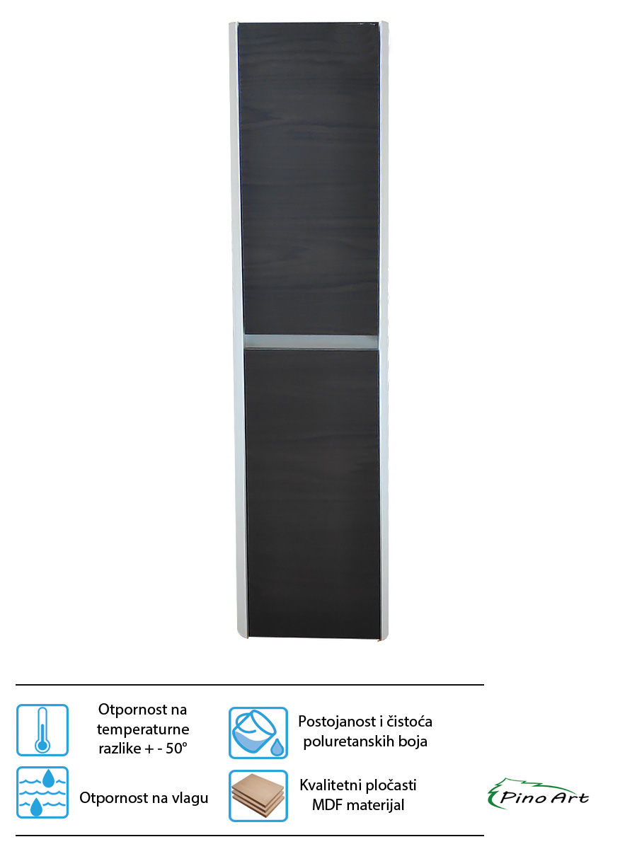 Vertikala konzolna Pino Art Urban 36cm sa korpom za veš. Izrađen od visoko kvalitetnog materijala sa najmodernijom tehnologijom u sferi izrada kupatilskog nameštaja. Predstavlja idealan spoj cene i kvaliteta. Front ormarića izrađen od oplemenjene iverice u dezenu tamnog oraha, bočni deo od pločastog MDF-a lakiran u belo visoki sjaj. Bojen poliuretanskim lakom koji pruža otpornost na vlagu, postojanost boje i duži vek trajanja. Funkcionalan ormarić ne zauzima mnogo prostora u kupatilo i pruža dosta mesta za odlaganje stvari. Lako se kombinuje sa drugim kupatilskim elementima. Atraktivanog dizajna, prepoznatljiv po kvalitetu i pažljivo izrađenim detaljima. Učiniće izgled vašeg kupatila modernim i jedinstvenim.