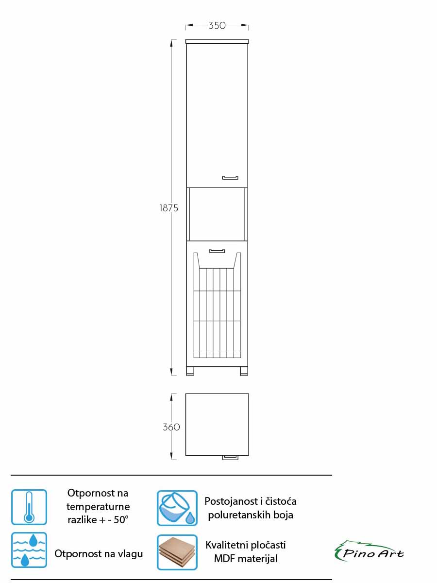 Vertikala sa korpom Pino-Art-Klasik 0106 je izrađen od visoko kvalitetnog materijala sa najmodernijom tehnologijom u sferi izrada kupatilskog nameštaja. Front ormarića izrađen od kvalitetnog pločastog MDF materijala, bočni deo od oplemenjene iverice. Podni/stojeći ormarić za kupatilo bojen poliuretanskim lakom koji pruža otpornost na vlagu, postojanost boje i visoki sjaj. Ručke metalne mat, nogari PVC mat. Sa korpom za veš, pruža dosta mesta za odlaganje stvari. Veoma modernog dizajna čime doprinosi ugođaju u vašem kupatilo. Učiniće vaš prostor elegantnim i funkcionalnim.