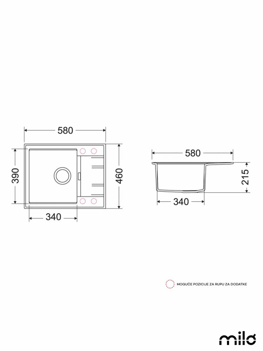 Sudopera je ugradna i ima mogućnost revirzibilnosti prilikom montaže. Sudopera ima 4 moguće pozicije otvora za slavinu i postavljanje dodataka.