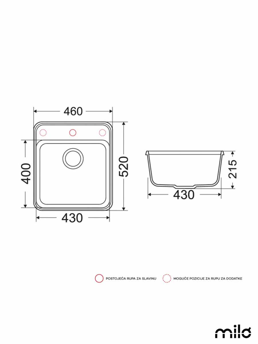 • Otvor za slavinu i 2 moguće pozicije otvora za postavku dodataka